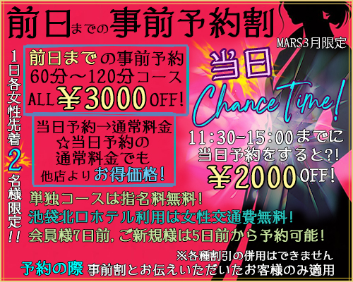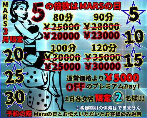 【前日事前🈹】 60分コース〜120分コース3,000円off 当日チャンスタイムあり❗️ 【1dayハーフコース🈹】 入れ替わり2人の女王様と🉐にプレイ 【ロング.ロング.ロング🈹】 150分コース〜オールナイトコースまで 【5の倍数はMARSの日】 ⚠️事前予約をオススメ致します。