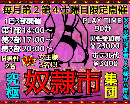 【奴隷市】 参加したお客様しかわからない 楽しいハプニング続出!! 1日3部 14時~17時~20時~ ※調整等の兼ね合いの為、お早目のお問い合わせ、ご予約をお勧め致します。