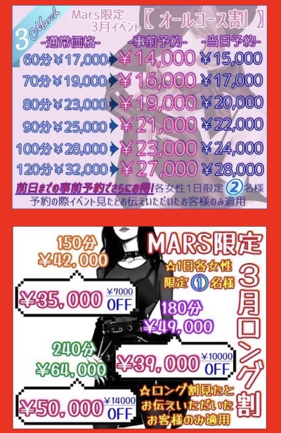 MARSの月間イベントも、60分コースから利用可能なオールコース割(こちらは前日までのご予約で更にお得に)や150分以上のコースで利用可能なロング割などがあります。