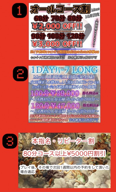 プレイ後その日のうちにお店に電話し、次の予約(次回一週間以内)をすると、80分以上のコースが割引となります。