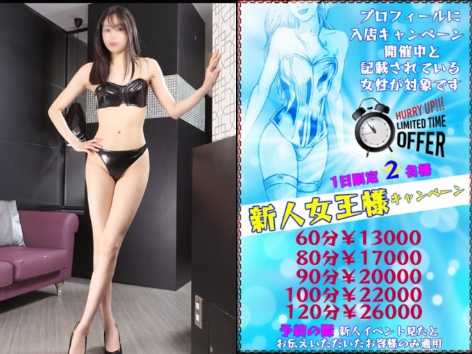 未経験、長身のキレカワ色白お姉様系です。 天音女王様&和泉女王様 ⚠️和泉女王様もしくは鈴華女王様との同日出勤日はリア友開催❗️ 60分26,000円 80分31,000円 100分41,000円 120分53,000円 指名料込み1日 先着1名様のみ早い者勝ち❗️