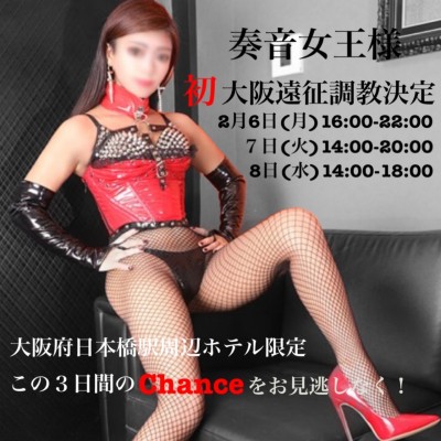 奏音女王様 【大阪遠征】決定!! 2月6日(月)16時〜22時 2月7日(火)14時〜20時 2月8日(水)14時〜18時 大阪遠征(日本橋エリア)のホテル限定になります。 奏音女王様談 『今年は強く凛々しくエロく』 SM人口を増やす為に関西遠征決まりました。 関西方面のお客様この機会をお見逃しなく!! 予約受付スタート 詳しくはお店にお電話くださいませ。