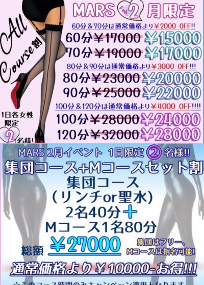 【オールコース割】 60分コースから120分コースまで 最大4000円OFF 1日各女性限定2名様 【集団コース+Mコースセット割】 集団コースはフリー、Mコースは指名可能 1日限定先着2名様 ※キャンペーン見たとお伝え頂いたお客様のみ適応