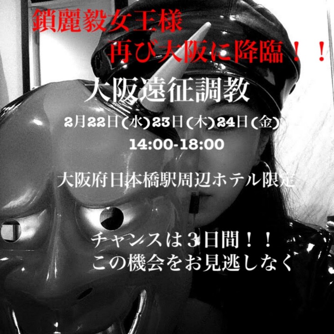 鎖麗毅女王様 【大阪遠征第3弾】決定!! 2月22日(水)23日(木)24日(金) 14時〜18時 大阪遠征(日本橋エリア)のリクエストにお答えして決まりました。 鎖麗毅女王様の得意プレイ 緊縛・吊り・格闘・マミープレイ 黄金調教(前日予約がおススメですが、当日も早めにご予約を頂けたらタイミング次第で可能です。) 詳しくはお店にお電話くださいませ。