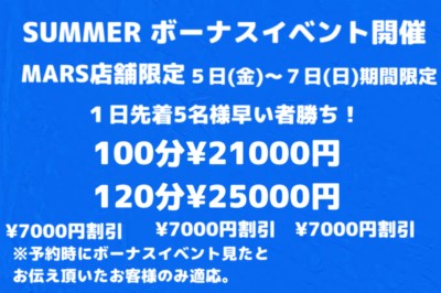 【前日事前コース割】 前日までに予約をするだけで! なんと80分コース以上が!! 前日¥5000円 当日¥3000円 【MARSの日】 5の倍数はこれで決まり! 60分も追加で「MARSの日が再び」 ※キャンペーン見たとお伝え頂いたお客様のみ適応