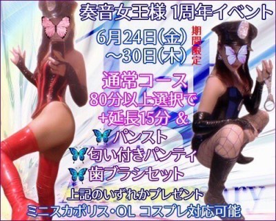 当店に未経験から入店され、著しく成長を遂げた【奏音女王様】が今月1周年を迎えます。 奏音女王様がお客様に感謝を込め、特別イベントを開催!! 「延長+私物プレゼント」