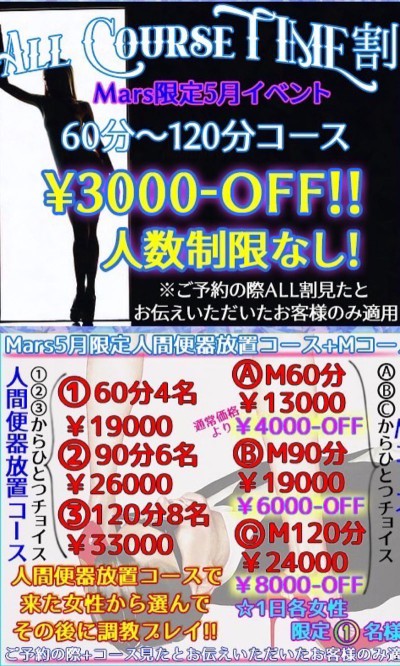 【All course Time割】 60分〜120分全ての時間に適応! ※人数制限もなし。 【人間便器放置コース+Mコースセット割】 実際に会った女性と、その後に調教が!リアル選びが実現! ※予約時に5月イベント見たとお伝え頂いたお客様のみ適応
