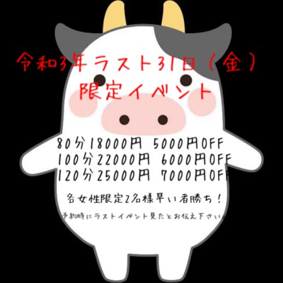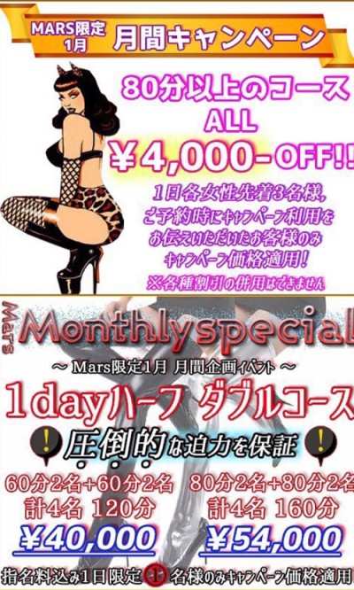 2022年1月月間キャンペーンのご案内です。 ①80分以上のコースをお選び頂けると4000円off 1日各女性先着3名様 年初めのプレイはお気に入りの女王様とロングプレイをオススメ致します。 ②1dayハーフダブルコース 指名料込み1日限定1名様のみ 年初めダブルプレイを存分に 楽しみたいお客様にオススメ致します。 ※ご予約時にキャンペーン利用をお伝え頂いたお客様のみ適応