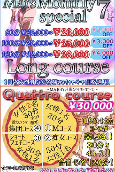21日(月) Mars限定6月のキャンペーン START DASH 各女性の1番手予約が5000円OFF 当日予約可能です。 お早めのご予約オススメ致します