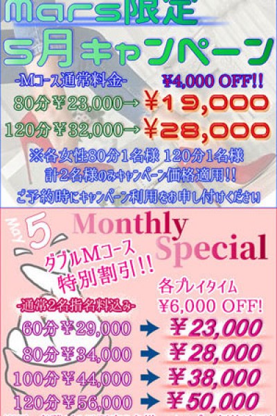 お待たせ致しました。 Mars限定5月のキャンペーン公開 80分コース・120分コースがお得です。 大人気ダブルMコースが特別割引 ご予約時にキャンペーン利用を お申し付けください ご予約お待ちしています。