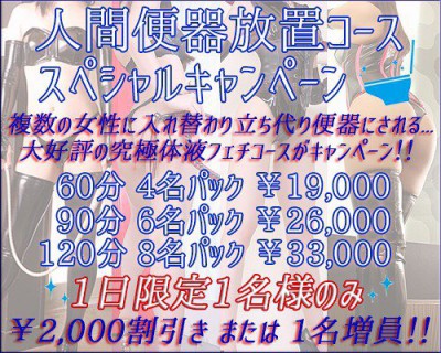 24日(土)25日2日間限定! 人間便器放置コースキャンペーン開催 週末聖水大好きなお客様お待ちしています。 限定1名様のみ 究極の体液コース・体液天国