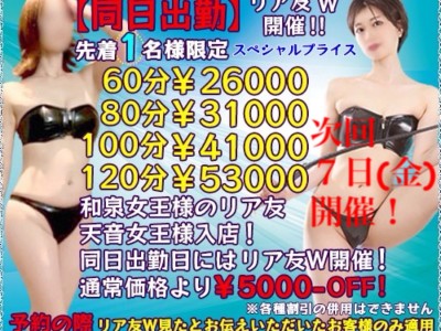 和泉女王様13時〜17時UP 天音女王様11時半〜15時半UP お早めのご予約をお願いします。 【和泉女王様】✖️【天音女王様】 先着1名様のみ早い者勝ち❗️