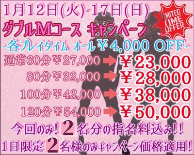 Mars店限定 1月12日(火)~17日(日)期間限定キャンペーン ダブルMコース 通常60分27000円→24000円 通常80分32000円→29000円 通常100分42000円→39000円 通常120分54000円→51000円 各3000円off 1名指名料込み 2人目指名2000円 1日2名様のみの受付になります 店長コラム見たとお問い合わせください