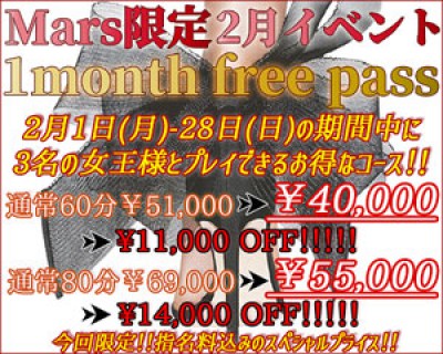 Mars限定2月イベント決まりました。 1 month free passコース 2月1日(月)~28日(日)の一ヶ月の間に 3名の女王様とプレイできるお得なキャンペーンです。 通常60分51000円→40000円 11000円off 通常80分69000円→55000円 14000円off 指名込みのスペシャルプライス 期間が一ヶ月ありますので 余裕持って対応できるかと 思います。 詳しくはお店にお問い合わせください。
