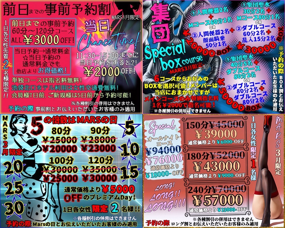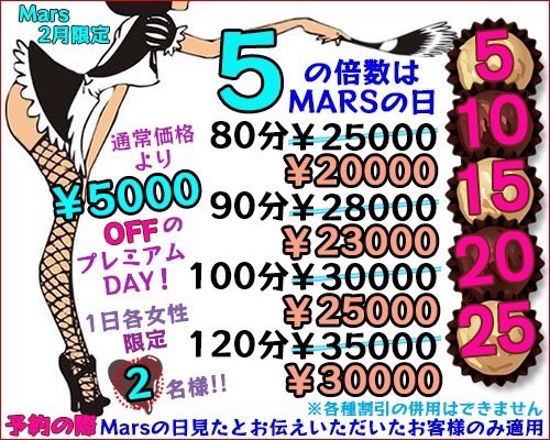 【前日事前🈹】 60分コース〜120分コース3,000円off 当日チャンスタイムあり❗️ 【1dayハーフコース🈹】 入れ替わり2人の女王様と🉐にプレイ 【ロング.ロング.ロング🈹】 150分コース〜オールナイトコースまで 【5の倍数はMARSの日】 ⚠️事前予約をオススメ致します。